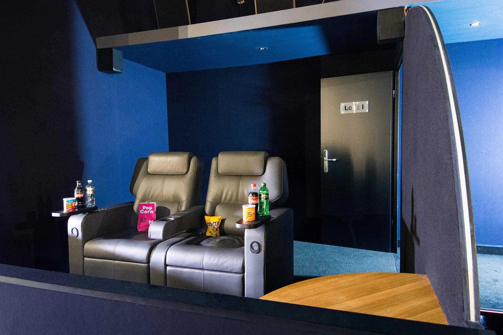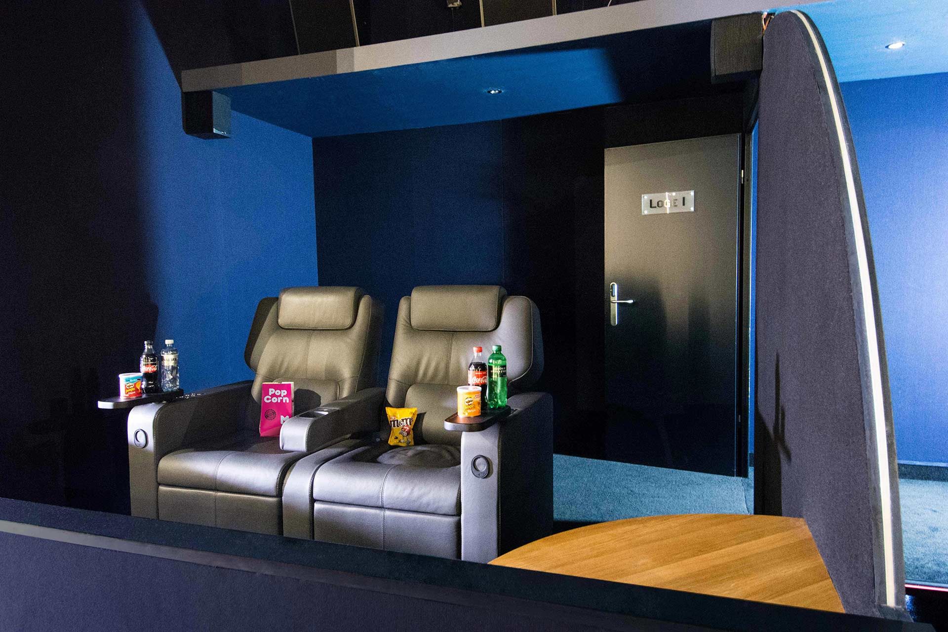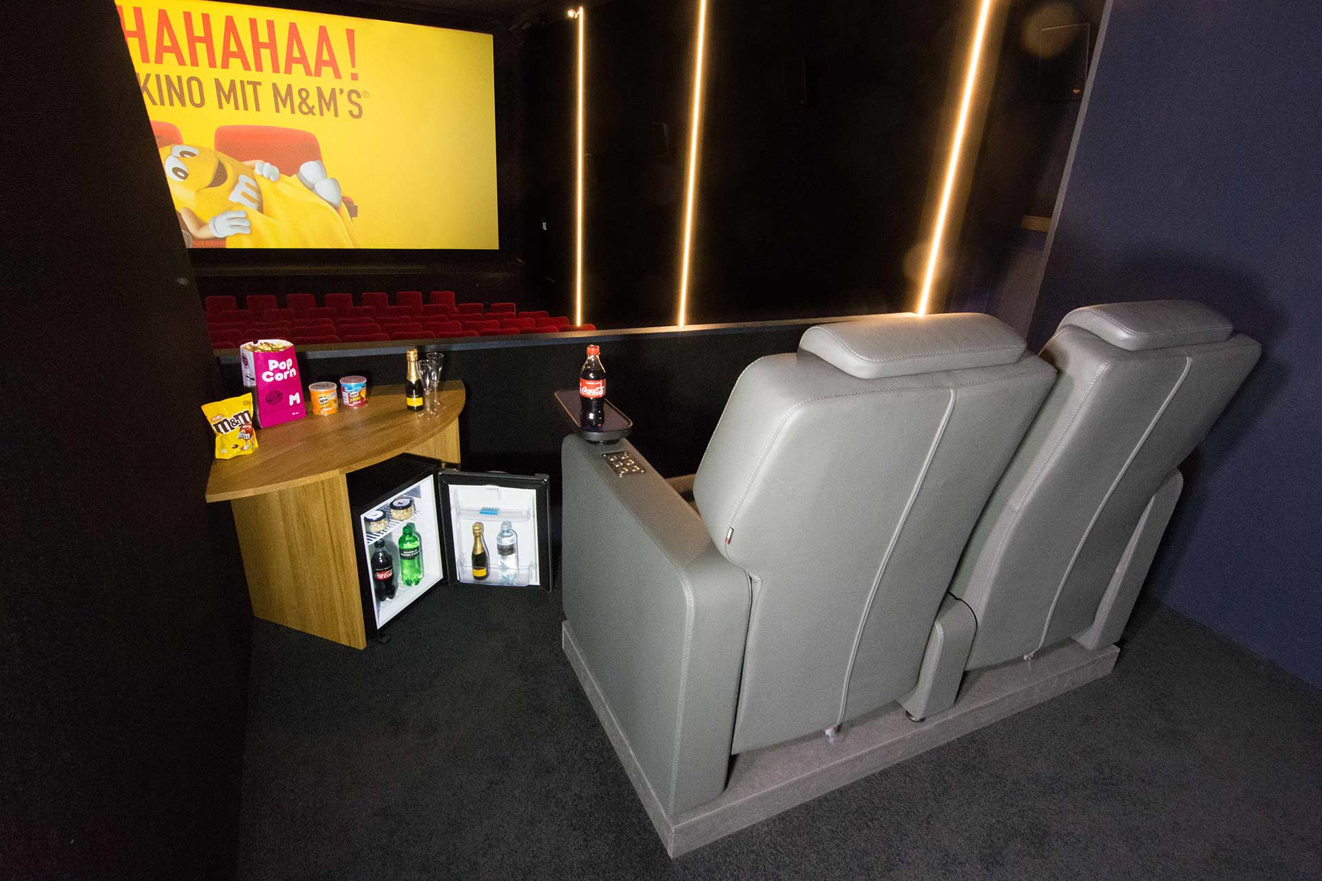 Jede Loge hat zwei elektrisch voll verstellbare Ledersessel und einen gefüllten Kühlschrank (2x Prosecco, 4x PET-Flaschen, 2x kleine Chips, 2x Nüssli, 1x M&Ms, 1x Popcorn medium).