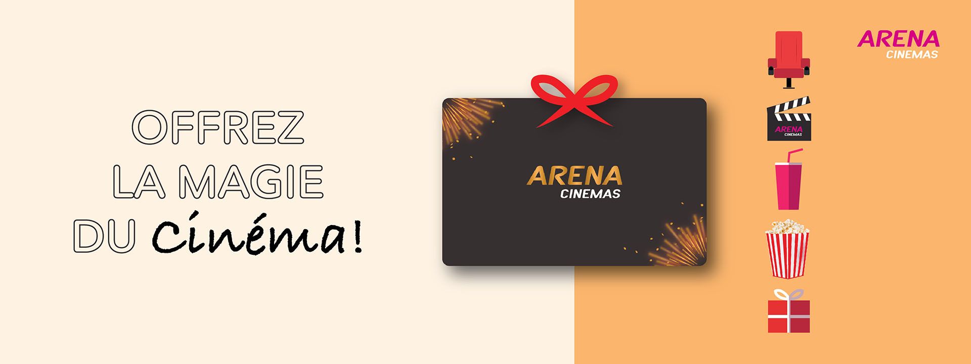 Désormais, vous pouvez acheter la carte cadeau Arena CInemas à notre billetterie pour offrir bien plus que du cinéma à votre bien-aimé(e) et vos proches.